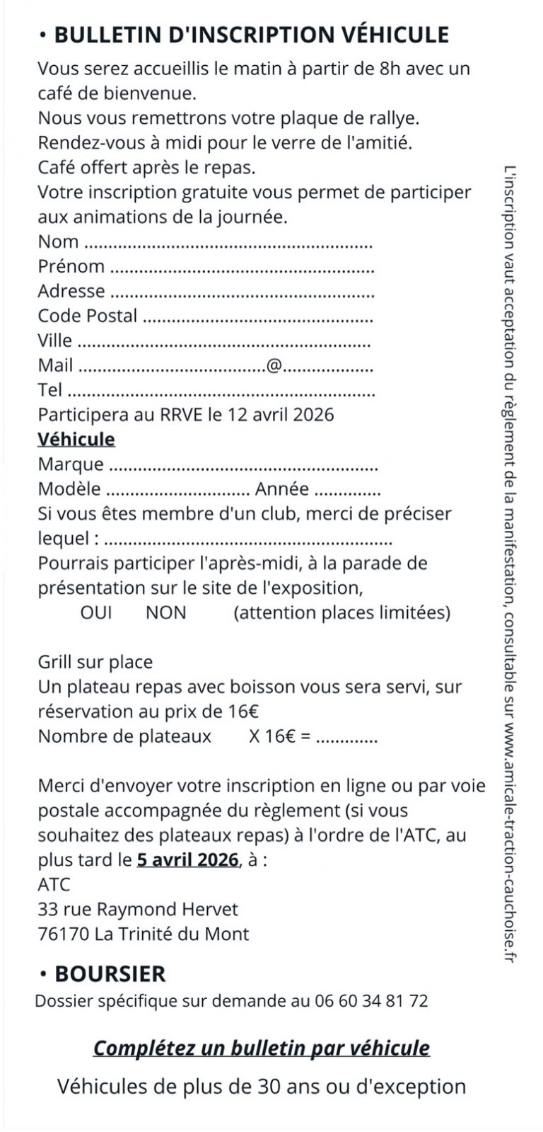 Vous possédez un véhicule d’époque ? Complétez le bulletin d’inscription en base de cette page ! Vous le trouverez également sur notre page événement : en cliquant ici ! Ce bulletin est à retourner par courrier postal à l’adresse indiquée, ou messagerie électronique s’il ne comporte pas de réservation de plateau-repas.